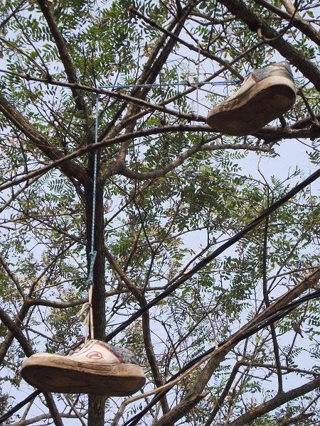 Na imagem abaixo, um par de tênis curiosamente posicionado nos galhos de uma árvore.